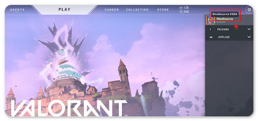 Untuk menemukan Riot ID Anda, buka halaman profil akun dan salin Riot ID+Tag menggunakan tombol yang tersedia disamping Riot ID. (Contoh: Westbourne#SEA)